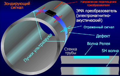 - принцип работы устройства основан на волноводном эхо-импульсном методе контроля. Ультразвуковые колебания в металлическом теле трубы возбуждаются и принимаются бесконтактно (без применения контактной жидкости) с помощью электромагнитно-акустического (ЭМА) преобразователя.